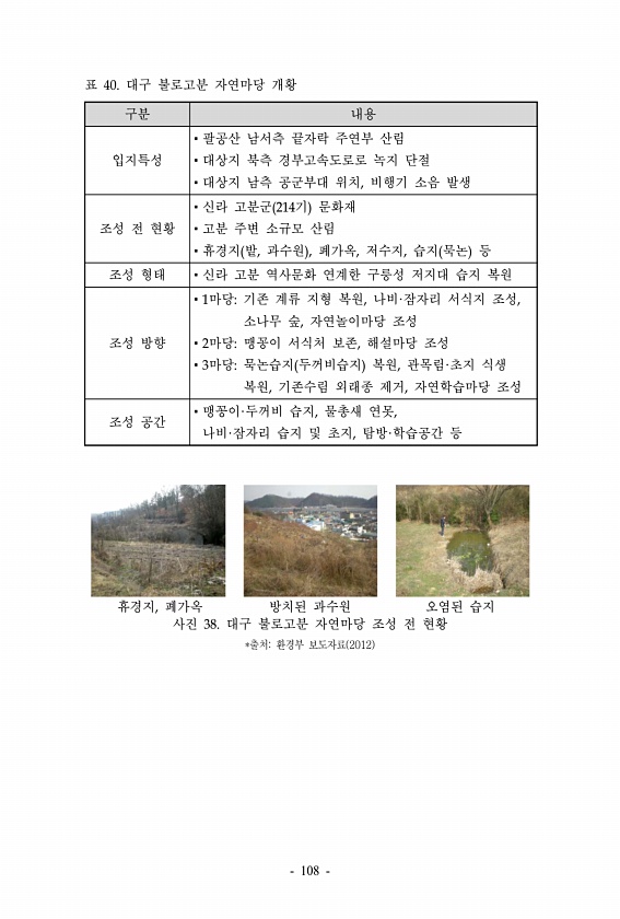 구분 내용 입지특성 ?팔공산 남서측 끝자락 주연부 산림 ?대상지 북측 경부고속도로로 녹지 단절 ?대상지 남측 공군부대 위치, 비행기 소음 발생 조성 전 현황 ?신라 고분군 214기 문화재 ?고분 주변 소규모 산림 ?휴경지 밭, 과수원 , 폐가옥, 저수지, 습지 묵논 등 조성 형태 ?신라 고분 역사문화 연계한 구릉성 저지대 습지 복원 조성 방향 ?1마당기존 계류 지형 복원, 나비·잠자리 서식지 조성, 소나무 숲, 자연놀이마당 조성 ?2마당맹꽁이 서식처 보존, 해설마당 조성 ?3마당묵논습지 두꺼비습지 복원, 관목림·초지 식생 복원, 기존수림 외래종 제거, 자연학습마당 조성 조성 공간 ?맹꽁이·두꺼비 습지, 물총새 연못, 나비·잠자리 습지 및 초지, 탐방·학습공간 등 표 40. 대구 불로고분 자연마당 개황 휴경지...