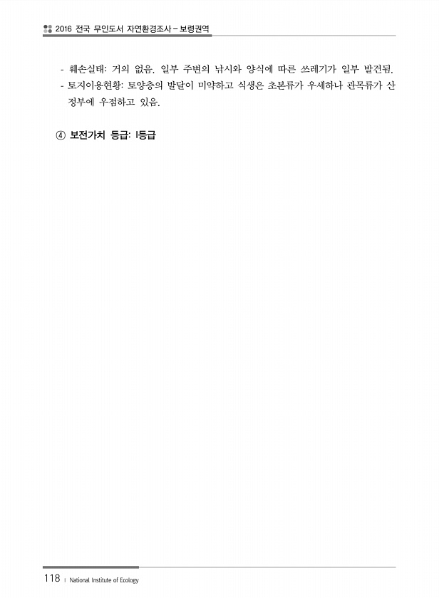 2016 전국 무인도서 자연환경조사 보령권역 118 ? National Institute of Ecology 훼손실태거의 없음. 일부 주변의 낚시와 양식에 따른 쓰레기가 일부 발견됨. 토지이용현황토양층의 발달이 미약하고 식생은 초본류가 우세하나 관목류가 산 정부에 우점하고 있음. ④ 보전가치 등급I등급