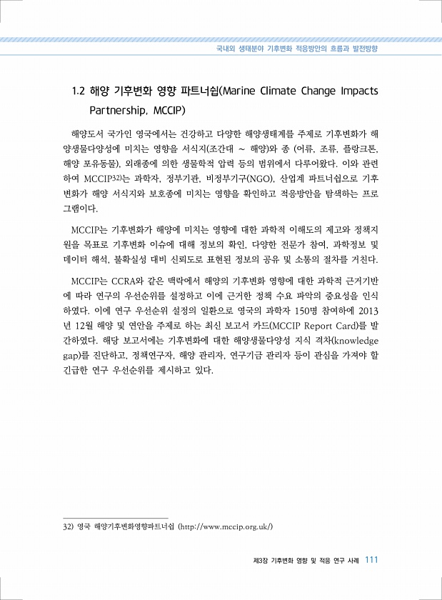 국내외 생태분야 기후변화 적응방안의 흐름과 발전방향 제3장 기후변화 영향 및 적응 연구 사례 111 1.2 해양 기후변화 영향 파트너쉽 Marine Climate Change Impacts Partnership, MCCIP 해양도서 국가인 영국에서는 건강하고 다양한 해양생태계를 주제로 기후변화가 해 양생물다양성에 미치는 영향을 서식지 조간대 ∼ 해양 와 종 어류, 조류, 플랑크톤, 해양 포유동물 , 외래종에 의한 생물학적 압력 등의 범위에서 다루어왔다. 이와 관련 하여 MCCIP32 는 과학자, 정부기관, 비정부기구 NGO , 산업계 파트너쉽으로 기후 변화가 해양 서식지와 보호종에 미치는 영향을 확인하고 적응방안을 탐색하는 프로 그램이다. MCCIP는 기후변화가 해양에 미치는 영향에 대한 과학적 이해도의 제...