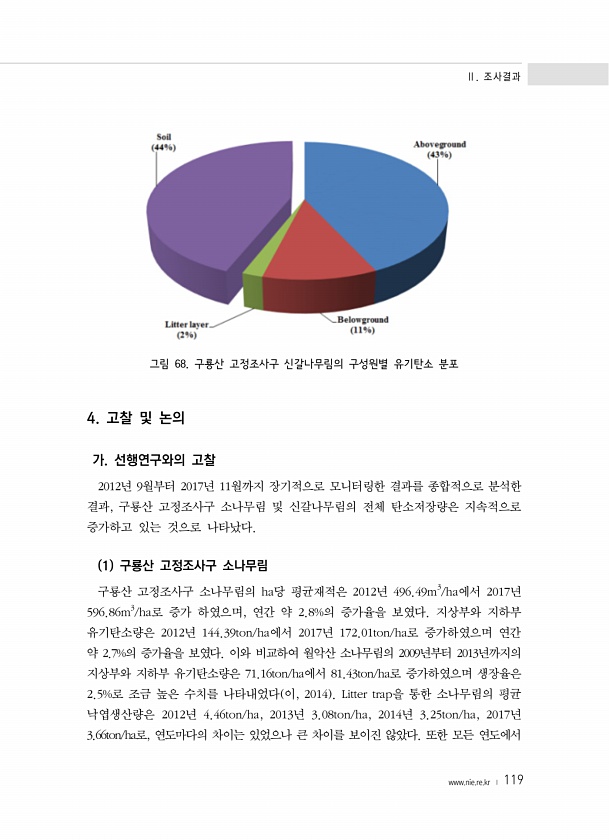 Ⅱ. 조사결과 www.nie.re.kr ? 119 그림 68. 구룡산 고정조사구 신갈나무림의 구성원별 유기탄소 분포 4. 고찰 및 논의 가. 선행연구와의 고찰 2012년 9월부터 2017년 11월까지 장기적으로 모니터링한 결과를 종합적으로 분석한 결과, 구룡산 고정조사구 소나무림 및 신갈나무림의 전체 탄소저장량은 지속적으로 증가하고 있는 것으로 나타났다. 1 구룡산 고정조사구 소나무림 구룡산 고정조사구 소나무림의 ha당 평균재적은 2012년 496.49m3/ha에서 2017년 596.86m3/ha로 증가 하였으며, 연간 약 2.8%의 증가율을 보였다. 지상부와 지하부 유기탄소량은 2012년 144.39ton/ha에서 2017년 172.01ton/ha로 증가하였으며 연간 약 2.7%의 증가율을 보였다. 이와 ...