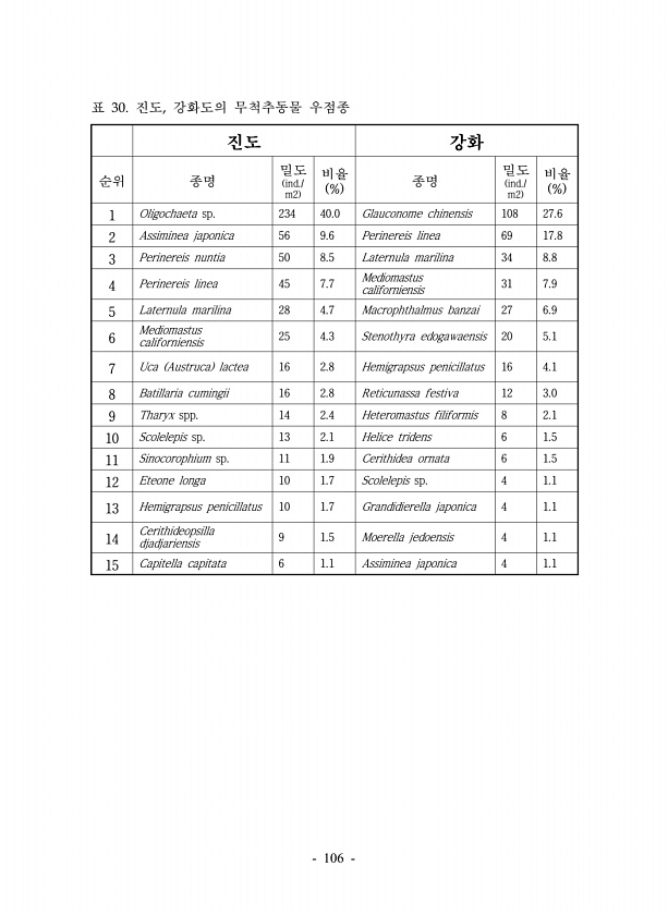 106 진도 강화 순위 종명 밀도 ind./ m2 비율 % 종명 밀도 ind./ m2 비율 % 1 Oligochaeta sp. 234 40.0 Glauconome chinensis 108 27.6 2 Assiminea japonica 56 9.6 Perinereis linea 69 17.8 3 Perinereis nuntia 50 8.5 Laternula marilina 34 8.8 4 Perinereis linea 45 7.7 Mediomastus californiensis 31 7.9 5 Laternula marilina 28 4.7 Macrophthalmus banzai 27 6.9 6 Mediomastus californiensis 25 4.3 Stenothyra edogawaensis 20 5.1 ...