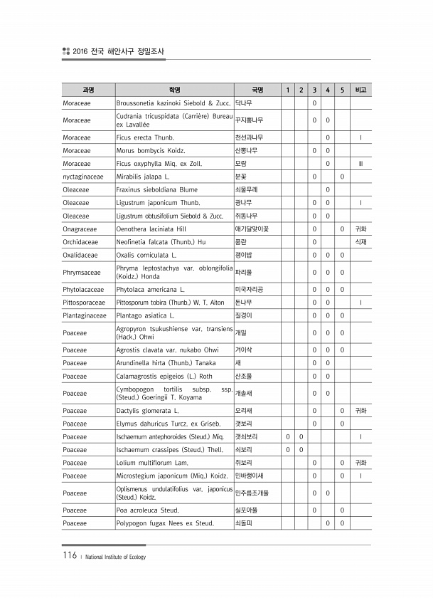 2016 전국 해안사구 정밀조사 116 ? National Institute of Ecology 과명 학명 국명 1 2 3 4 5 비고 Moraceae Broussonetia kazinoki Siebold & Zucc. 닥나무 0 Moraceae Cudrania tricuspidata Carrie?re Bureau ex Lavalle?e 꾸지뽕나무 0 0 Moraceae Ficus erecta Thunb. 천선과나무 0 Ⅰ Moraceae Morus bombycis Koidz. 산뽕나무 0 0 Moraceae Ficus oxyphylla Miq. ex Zoll. 모람 0 Ⅲ nyctaginaceae Mirabilis jalapa L. 분꽃 0 0 Oleaceae Fraxinus sieboldiana Blum...