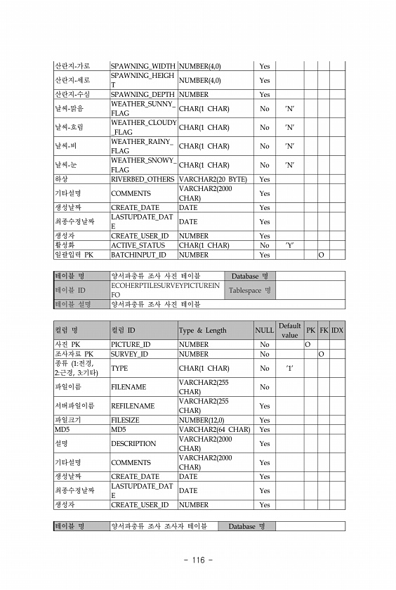 116 산란지-가로 SPAWNING_WIDTH NUMBER 4,0 Yes 산란지-세로 SPAWNING_HEIGH T NUMBER 4,0 Yes 산란지-수심 SPAWNING_DEPTH NUMBER Yes 날씨-맑음 WEATHER_SUNNY_ FLAG CHAR 1 CHAR No N날씨-흐림 WEATHER_CLOUDY _FLAG CHAR 1 CHAR No N날씨-비 WEATHER_RAINY_ FLAG CHAR 1 CHAR No N날씨-눈 WEATHER_SNOWY_ FLAG CHAR 1 CHAR No N하상 RIVERBED_OTHERS VARCHAR2 20 BYTE Yes 기타설명 COMMENTS VARCHAR2 2000 CHAR Yes 생성날짜 CREATE_DATE DATE Yes 최종수정날짜 LASTUPDATE...