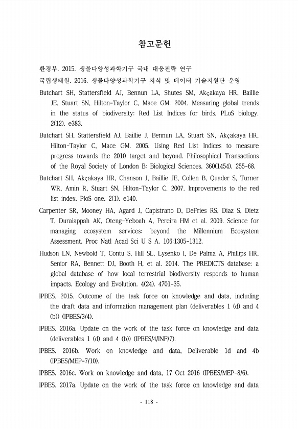 참고문헌 환경부. 2015. 생물다양성과학기구 국내 대응전략 연구 국립생태원. 2016. 생물다양성과학기구 지식 및 데이터 기술지원단 운영 Butchart SH, Stattersfield AJ, Bennun LA, Shutes SM, Ak?akaya HR, Baillie JE, Stuart SN, Hilton-Taylor C, Mace GM. 2004. Measuring global trends in the status of biodiversityRed List Indices for birds. PLoS biology. 2 12 e383. Butchart SH, Stattersfield AJ, Baillie J, Bennun LA, Stuart SN, Ak?akaya HR, Hilton-Taylor C, M...
