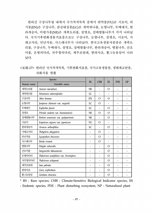 97 한라산 구상나무림 내에서 국가적색목록 중에서 취약종 VU 은 시로미, 위 기종 EN 은 구상나무, 관심대상종 LC 은 게박쥐나물, 눈향나무, 두메대극, 한 라개승마, 미평가종 NE 은 개족도리풀, 설앵초, 섬매발톱나무가 각각 나타났 다. 국가기후변화생물지표종으로는 구상나무, 눈향나무, 설앵초, 시로미, 가 래고사리, 만년석송, 사스래나무가 나타났다. 한국고유생물자원종은 개족도 리풀, 구상나무, 두메대극, 설앵초, 섬매발톱나무, 한라개승마, 병꽃나무, 산오 이풀, 은꿩의다리, 자주꿩의다리, 제주조릿대, 한라사초, 흰그늘용담이 나타 났다. Species RS CSBI ES PDE NP Korean name Scientific name 개족도리풀 Asarum maculatum NE O 게박쥐나물 Parase...
