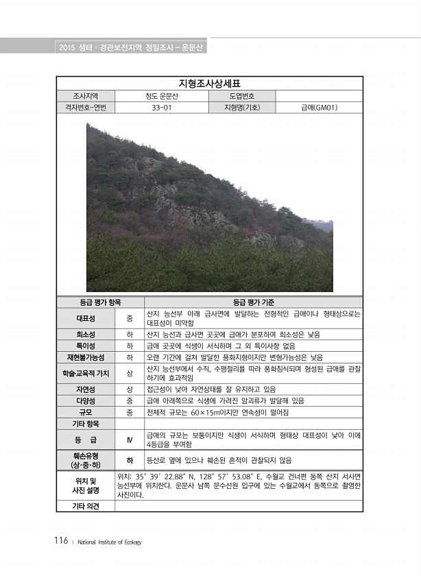 2015 생태·경관보전지역 정밀조사 운문산 116 ? National Institute of Ecology 지형조사상세표 조사지역 청도 운문산 도엽번호 격자번호-연번 33-01 지형명 기호 급애 GM01 등급 평가 항목 등급 평가 기준 대표성 중 산지 능선부 아래 급사면에 발달하는 전형적인 급애이나 형태상으로는 대표성이 미약함 희소성 하 산지 능선과 급사면 곳곳에 급애가 분포하여 희소성은 낮음 특이성 하 급애 곳곳에 식생이 서식하며 그 외 특이사항 없음 재현불가능성 하 오랜 기간에 걸쳐 발달한 풍화지형이지만 변형가능성은 낮음 학술?교육적 가치 상 산지 능선부에서 수직, 수평절리를 따라 풍화침식되며 형성된 급애를 관찰 하기에 효과적임 자연성 상 접근성이 낮아 자연상태를 잘 유지하고 있음 다양성 중 급애 아래쪽...
