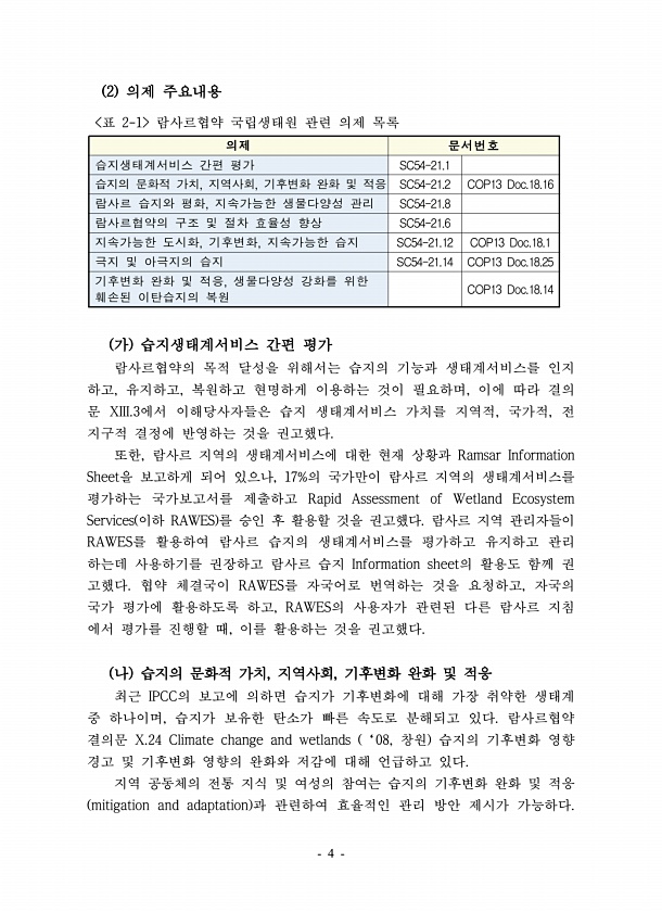 4 2 의제 주요내용 표 2-1 람사르협약 국립생태원 관련 의제 목록 의제 문서번호 습지생태계서비스 간편 평가 SC54-21.1 습지의 문화적 가치, 지역사회, 기후변화 완화 및 적응 SC54-21.2 COP13 Doc.18.16 람사르 습지와 평화, 지속가능한 생물다양성 관리 SC54-21.8 람사르협약의 구조 및 절차 효율성 향상 SC54-21.6 지속가능한 도시화, 기후변화, 지속가능한 습지 SC54-21.12 COP13 Doc.18.1 극지 및 아극지의 습지 SC54-21.14 COP13 Doc.18.25 기후변화 완화 및 적응, 생물다양성 강화를 위한 훼손된 이탄습지의 복원 COP13 Doc.18.14 가 습지생태계서비스 간편 평가 람사르협약의 목적 달성을 위해서는 습지의 기능과 생태계서비스를 인지...