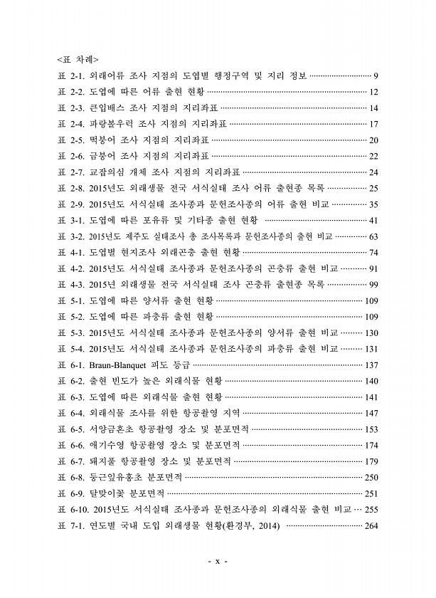 x 표 차례 표 2-1. 외래어류 조사 지점의 도엽별 행정구역 및 지리 정보 ···························· 9 표 2-2. 도엽에 따른 어류 출현 현황 ······································································· 12 표 2-3. 큰입배스 조사 지점의 지리좌표 ································································· 14 표 2-4. 파랑볼우럭 조사 지점의 지리좌표 ····························································· 17 표 2-5. 떡붕어 조사 지점의 지리좌표 ······················...