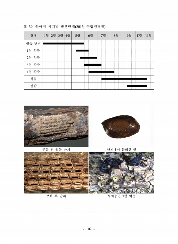 102 부화 전 월동 난괴 난괴에서 분리한 알 부화 후 난괴 부화중인 1령 약충 표 39. 꽃매미 시기별 발생단계 2015, 국립생태원 형태 1월 2월 3월 4월 5월 6월 7월 8월 9월 10월 11월 월동 난괴 1령 약충 2령 약충 3령 약충 4령 약충 성충산란