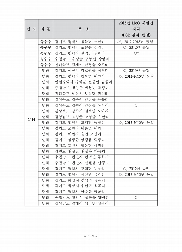년 도 작 물 주 소 년 재발견 지역 결과 반영 2014 옥수수 경기도 평택시 청북면 어연리 ○*, 2012-2013년 동일 옥수수 경기도 평택시 포승읍 신영리 ○, 2012년 동일 옥수수 경기도 평택시 현덕면 권관리 ○* 옥수수 충청남도 홍성군 구항면 장양리 옥수수 전라북도 김제시 만경읍 소토리 면화 경기도 이천시 장호원읍 이황리 ○, 2013년 동일 면화 경기도 평택시 청북면 어연리 ○, 2012-2013년 동일 면화 인천광역시 강화군 선원면 금월리 면화 충청남도 청양군 비봉면 록평리 면화 전라북도 남원시 보절면 진기리 면화 경상북도 경주시 안강읍 육통리 면화 경상북도 경주시 안강읍 사방리 ○ 면화 경상북도 경주시 천북면 모아리 면화 경상남도 고성군 고성읍 우산리 면화 경기도 평택시 고덕면 동청리 ○, ...
