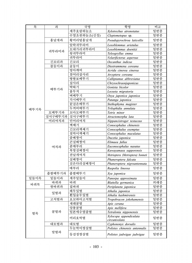 103 목 과 국명 학명 비고 제주호랑하늘소 Xylotrechus atronotatus 일반종 수염초원하늘소 신칭 Cleptometopus sp. 일반종 홍날개과 황머리털홍날개 Pseudopyrochroa laticollis 일반종 메뚜기목 귀뚜라미과 알락귀뚜라미 Loxoblemmus arietulus 일반종 모대가리귀뚜라미 Loxoblemmus doenitzi 일반종 왕귀뚜라미 Teleogryllus emma 일반종 귀뚜라미 Velarifictorus aspersus 일반종 긴꼬리과 긴꼬리 Oecanthus indicus 일반종 꼽등이과 곱등이 Diestrammena coreana 일반종 메뚜기과 방아깨비 Acrida cinerea cinerea 일반종 참어리삽사리 Arcyptera coreana 일반종 ...