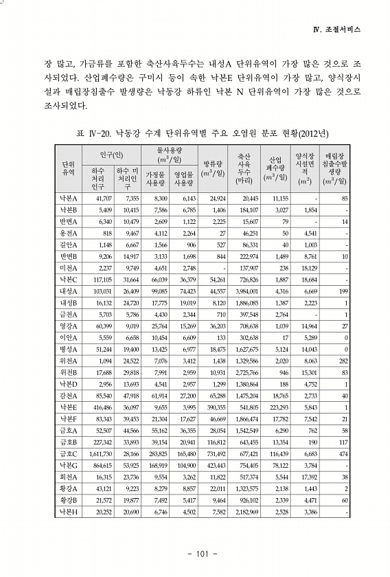 Ⅳ. 조절서비스 101 장 많고, 가금류를 포함한 축산사육두수는 내성A 단위유역이 가장 많은 것으로 조 사되었다. 산업폐수량은 구미시 등이 속한 낙본E 단위유역이 가장 많고, 양식장시 설과 매립장침출수 발생량은 낙동강 하류인 낙본 N 단위유역이 가장 많은 것으로 조사되었다. 단위 유역 인구 인 물사용량 ?/일 방류량 ?/일 축산 사육 두수 마리 산업 폐수량 ?/일 양식장 시설면 적? 매립장 침출수발 생량 ?/일 하수 처리 인구 하수 미 처리인 구 가정물 사용량 영업물 사용량 낙본A 41,707 7,355 8,300 6,143 24,924 20,445 11,155 85 낙본B 5,409 10,415 7,586 6,785 1,406 184,107 3,027 1,854 반변A 6,340 10,479 2,...