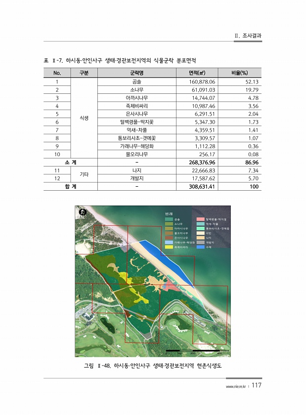 Ⅱ. 조사결과 www.nie.re.kr ? 117 No. 구분 군락명 면적 ㎡ 비율 % 1 식생 곰솔 160,878.06 52.13 2 소나무 61,091.03 19.79 3 아까시나무 14,744.07 4.78 4 족제비싸리 10,987.46 3.56 5 은사시나무 6,291.51 2.04 6 털백령풀-딱지꽃 5,347.30 1.73 7 억새-차풀 4,359.51 1.41 8 통보리사초-갯메꽃 3,309.57 1.07 9 가래나무-해당화 1,112.28 0.36 10 물오리나무 256.17 0.08 소 계 268,376.96 86.96 11 기타 나지 22,666.83 7.34 12 개발지 17,587.62 5.70 합 계 308,631.41 100 표 Ⅱ-7. 하시동·안인사구 생태·경관보전지역의 식물군락...