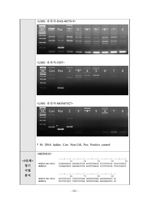 111 LMO 유전자-DAS-40278-9 LMO 유전자-5307 LMO 유전자-MON87427 * MDNA ladder, ConNon-LM, PosPositive control 3단계 염기 서열 분석 MON810