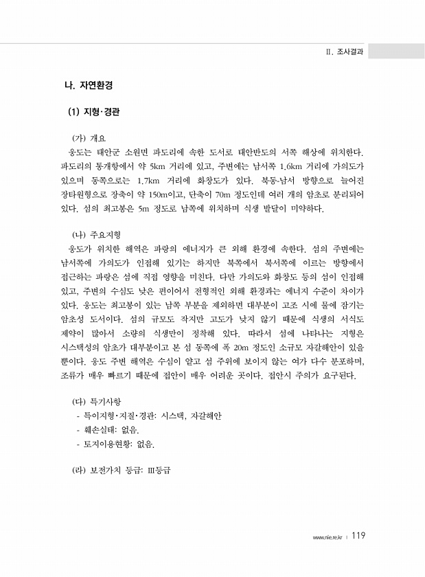 Ⅱ. 조사결과 www.nie.re.kr ? 119 나. 자연환경 1 지형?경관 가 개요 웅도는 태안군 소원면 파도리에 속한 도서로 태안반도의 서쪽 해상에 위치한다. 파도리의 통개항에서 약 5km 거리에 있고, 주변에는 남서쪽 1.6km 거리에 가의도가 있으며 동쪽으로는 1.7km 거리에 화창도가 있다. 북동-남서 방향으로 늘어진 장타원형으로 장축이 약 150m이고, 단축이 70m 정도인데 여러 개의 암초로 분리되어 있다. 섬의 최고봉은 5m 정도로 남쪽에 위치하며 식생 발달이 미약하다. 나 주요지형 웅도가 위치한 해역은 파랑의 에너지가 큰 외해 환경에 속한다. 섬의 주변에는 남서쪽에 가의도가 인접해 있기는 하지만 북쪽에서 북서쪽에 이르는 방향에서 접근하는 파랑은 섬에 직접 영향을 미친다. 다만 가의도와 화창...