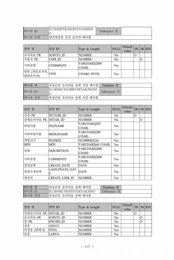 117 테이블 ID ECOHERPTILESURVEYUSERINF O Tablespace 명 테이블 설명 양서파충류 조사 조사자 테이블 컬럼 명 컬럼 ID Type & Length NULL Default value PK FK IDX 조사자료 PK SURVEY_ID NUMBER No O 사용자 PK USER_ID NUMBER No O 기타설명 COMMENTS VARCHAR2 2000 CHAR Yes 종류 전문조사자, 일반조사자 TYPE CHAR 1 BYTE Yes 테이블 명 육상곤충 조사자료 상세 사진 테이블 Database 명 테이블 ID ECOINSECTSURBEYDETAILPICINF O Tablespace 명 테이블 설명 육상곤충 조사자료 상세 사진 테이블 컬럼 명 컬럼 ID Type & Length N...