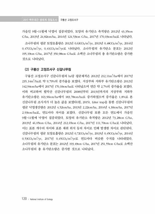 2017 백두대간 생태계 정밀조사 구룡산 고정조사구 120 ? National Institute of Ecology 가을인 9월11월에 낙엽이 집중되었다. 토양의 유기탄소 축적량은 2012년 43.35ton C/ha, 2013년 24.82ton/ha, 2014년 124.53ton C/ha, 2017년 170.03ton/ha로 나타났다. 소나무림의 평균 토양호흡량은 2012년 0.63CO2/m2/yr, 2013년 0.48CO2/m2/yr, 2014년 0.47CO2/m2/yr, 0.41CO2/m2/yr로 나타났다. 소나무림의 유기탄소 분포는 2012년 195.19ton C/ha, 2017년 350.98ton C/ha로 소백산 소나무림의 총 유기탄소량은 증가한 것으로 나타났다. 2 구룡산 고정조사구 신갈나무림 구...