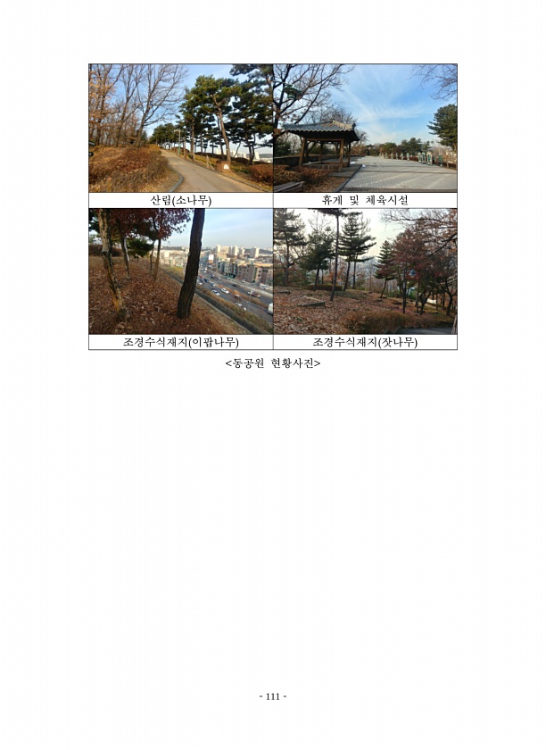 111 산림 소나무 휴게 및 체육시설 조경수식재지 이팝나무 조경수식재지 잣나무 동공원 현황사진 111