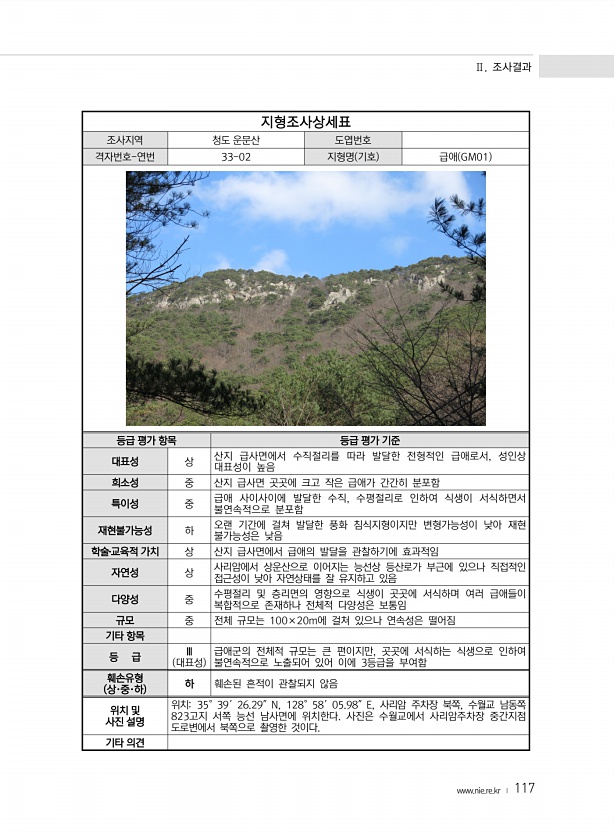 Ⅱ. 조사결과 www.nie.re.kr ? 117 지형조사상세표 조사지역 청도 운문산 도엽번호 격자번호-연번 33-02 지형명 기호 급애 GM01 등급 평가 항목 등급 평가 기준 대표성 상 산지 급사면에서 수직절리를 따라 발달한 전형적인 급애로서, 성인상 대표성이 높음 희소성 중 산지 급사면 곳곳에 크고 작은 급애가 간간히 분포함 특이성 중 급애 사이사이에 발달한 수직, 수평절리로 인하여 식생이 서식하면서 불연속적으로 분포함 재현불가능성 하 오랜 기간에 걸쳐 발달한 풍화 침식지형이지만 변형가능성이 낮아 재현 불가능성은 낮음 학술?교육적 가치 상 산지 급사면에서 급애의 발달을 관찰하기에 효과적임 자연성 상 사리암에서 상운산으로 이어지는 능선상 등산로가 부근에 있으나 직접적인 접근성이 낮아 자연상태를 잘 유지하...