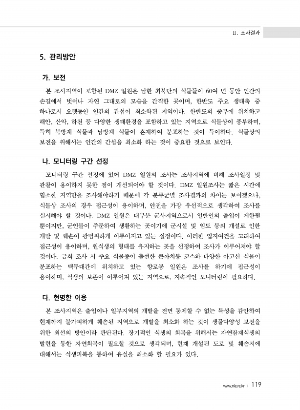 Ⅱ. 조사결과 www.nie.re.kr ? 119 5. 관리방안 가. 보전 본 조사지역이 포함된 DMZ 일원은 남한 최북단의 식물들이 60여 년 동안 인간의 손길에서 벗어나 자연 그대로의 모습을 간직한 곳이며, 한반도 주요 생태축 중 하나로서 오랫동안 인간의 간섭이 최소화된 지역이다. 한반도의 중부에 위치하고 해안, 산악, 하천 등 다양한 생태환경을 포함하고 있는 지역으로 식물상이 풍부하며, 특히 북방계 식물과 남방계 식물이 혼재하여 분포하는 것이 특이하다. 식물상의 보전을 위해서는 인간의 간섭을 최소화 하는 것이 중요한 것으로 보인다. 나. 모니터링 구간 선정 모니터링 구간 선정에 있어 DMZ 일원의 조사는 조사지역에 비해 조사일정 및 관찰이 용이하지 못한 점이 개선되어야 할 것이다. DMZ 일원조사는 짧...