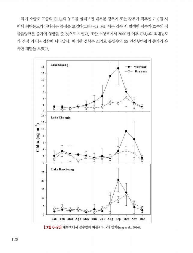 128 과거 소양호 표층의 Chl.a의 농도를 살펴보면 대부분 강우기 또는 강우기 직후인 7-8월 사 이에 최대농도가 나타나는 특징을 보였다 그림 6-24, 25 이는 강우 시 발생한 탁수가 호수의 식 물플랑크톤 증가에 영향을 준 것으로 보인다. 또한 소양호에서 2000년 이후 Chl.a의 최대농도 가 점점 커지는 경향이 나타났다. 이러한 경향은 소양호 유입수의 SS 연간부하량의 증가와 유 사한 패턴을 보였다. [그림 6-25] 대형호에서 강수량에 따른 Chl.a의 변화 Jung et al., 2016