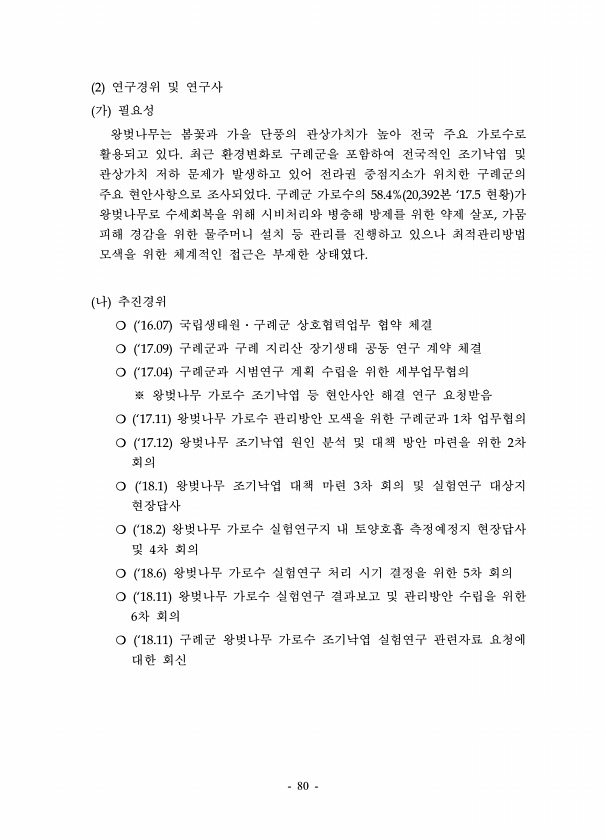 80 2 연구경위 및 연구사 가 필요성 왕벚나무는 봄꽃과 가을 단풍의 관상가치가 높아 전국 주요 가로수로 활용되고 있다. 최근 환경변화로 구례군을 포함하여 전국적인 조기낙엽 및 관상가치 저하 문제가 발생하고 있어 전라권 중점지소가 위치한 구례군의 주요 현안사항으로 조사되었다. 구례군 가로수의 58.4% 20,392본 ‘17.5 현황 가 왕벚나무로 수세회복을 위해 시비처리와 병충해 방제를 위한 약제 살포, 가뭄 피해 경감을 위한 물주머니 설치 등 관리를 진행하고 있으나 최적관리방법 모색을 위한 체계적인 접근은 부재한 상태였다. 나 추진경위 ? ‘16.07 국립생태원?구례군 상호협력업무 협약 체결 ? ‘17.09 구례군과 구례 지리산 장기생태 공동 연구 계약 체결 ? ‘17.04 구례군과 시범연구 계획 수립을 ...