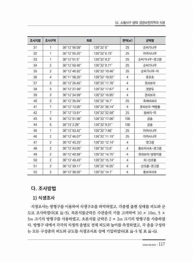iii. 소황사구 생태·경관보전지역의 식생 www.nie.re.kr ?117 1 식생조사는 방형구를 이용하여 식생구조를 파악하였고, 각종별 출현 상태를 피도와 군 도로 조사하였다 표 ⅲ-5 목본식물군락은 수관층의 키를 고려하여 10 × 10m, 5 × 5m 크기의 방형구를 사용하였고, 초본식물 군락은 2 × 2m 크기의 방형구를 사용하였 다. 방형구 내에서 각각의 식생의 층별로 전체 피도와 높이를 측정하였고, 각 층을 구성하 는 모든 구성종의 피도와 군도를 식생조사표 상에 기입하였다 표 ⅲ-5 및 표 ⅲ-6 조사지점 조사구역 좌표 면적 ㎡ 군락명 31 1 36°12′56.09″ 126°32′6″ 25 순비기나무 32 1 36°12′55.25″ 126°32′6.73″ 25 아까시나무 33 1 36°12′51....