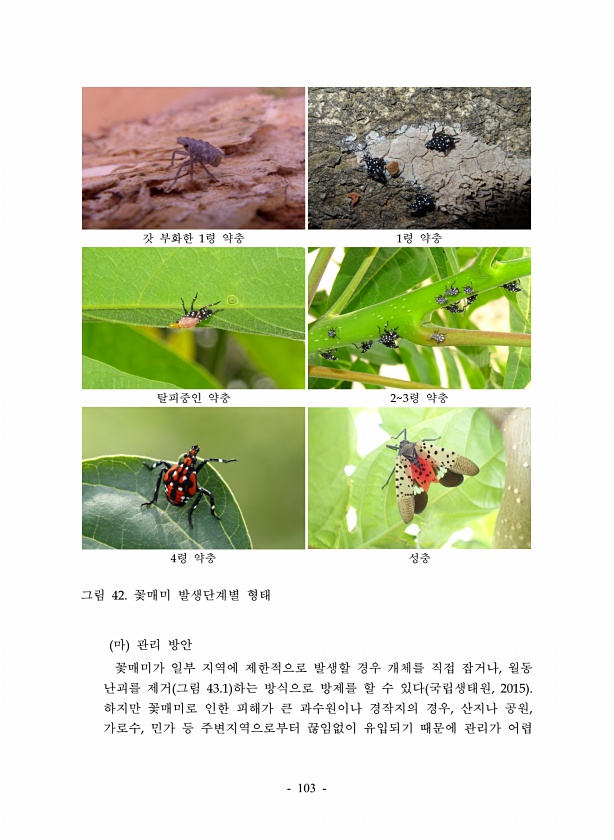 103 갓 부화한 1령 약충 1령 약충 탈피중인 약충 23령 약충 4령 약충 성충 그림 42. 꽃매미 발생단계별 형태 마 관리 방안 꽃매미가 일부 지역에 제한적으로 발생할 경우 개체를 직접 잡거나, 월동 난괴를 제거 그림 43.1 하는 방식으로 방제를 할 수 있다 국립생태원, 2015 하지만 꽃매미로 인한 피해가 큰 과수원이나 경작지의 경우, 산지나 공원, 가로수, 민가 등 주변지역으로부터 끊임없이 유입되기 때문에 관리가어렵