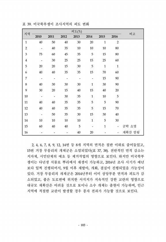 103 지역 피도 % 비고 2010 2011 2012 2013 2014 2015 2016 1 40 50 40 30 20 1 2 2 40 35 10 10 10 80 3 75 60 45 35 5 15 80 4 30 25 25 15 25 60 5 20 20 15 30 5 1 1 6 40 40 35 35 15 70 60 7 15 90 8 40 30 30 30 1 30 90 9 30 20 15 40 15 40 20 10 30 35 1 10 5 11 40 40 35 35 5 5 90 12 40 40 35 35 5 15 70 13 50 35 30 15 30 40 14 10 10 10 10 1 5 30 15 60 40 40 5 1 군락 소멸 16 40 20 재확산 안됨 표 39. 미국쑥부쟁이 조사지역의 피도 변화 2, 4...
