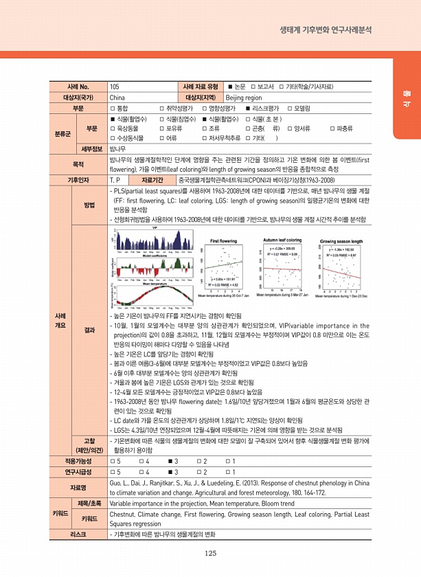 125 생태계 기후변화 연구사례분석 식 물 사례 No. 105 사례 자료 유형 ■ 논문 □ 보고서 □ 기타 학술/기사자료 대상지 국가 China 대상지 지역 Beijing region 부문 □ 통합 □ 취약성평가 □ 영향성평가 ■ 리스크평가 □ 모델링 분류군 부문 ■ 식물 활엽수 □ 식물 침엽수 ■ 식물 활엽수 □ 식물 초 본 □ 육상동물 □ 포유류 □ 조류 □ 곤충 류 □ 양서류 □ 파충류 □ 수상동식물 □ 어류 □ 저서무척추류 □ 기타 세부정보 밤나무 목적 밤나무의 생물계절학적인 단계에 영향을 주는 관련된 기간을 정의하고 기온 변화에 의한 봄 이벤트 first flowering , 가을 이벤트 leaf coloring 와 length of growing season의 반응을 종합적으로 측정 기후인자 T,...
