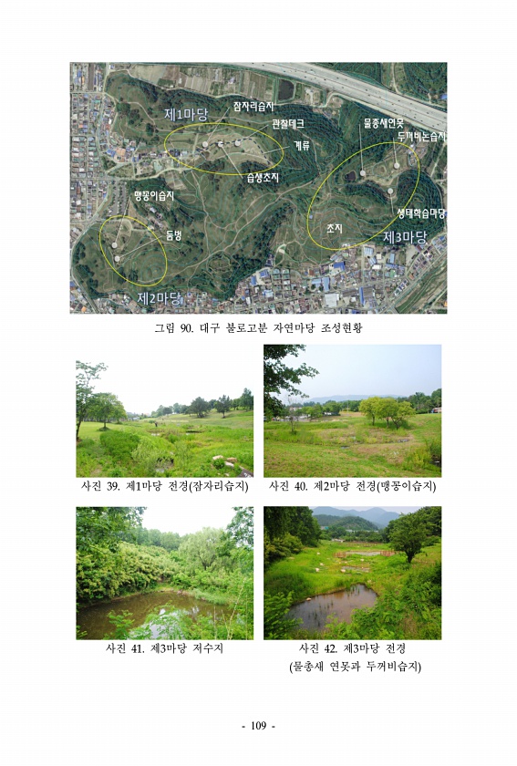 그림 90. 대구 불로고분 자연마당 조성현황 사진 39. 제1마당 전경 잠자리습지 사진 40. 제2마당 전경 맹꽁이습지 사진 41. 제3마당 저수지 사진 42. 제3마당 전경 물총새 연못과 두꺼비습지 109
