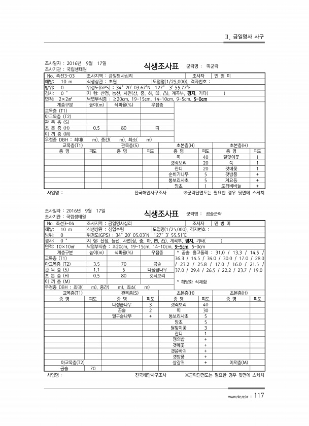 Ⅱ. 금일명사 사구 www.nie.re.kr ? 117 조사일자 2016년 9월 17일 조사기관 국립생태원 식생조사표 군락명 띠군락 No. 측선3-03 조사지역 금일명사십리 조사자 민 병 미 해발10 m 식생상관 초원 도엽명 1/25,000 , 격자번호 방위0 위경도 GPS 34°2003.67N 127° 355.77E 경사0 ° 지 형산정, 능선, 사면 상, 중, 하, 凹, 凸 , 계곡부, 평지, 기타 면적2×2㎡ 낙엽부식층 ≥20cm, 19-15cm, 14-10cm, 9-5cm, 5-0cm 계층구분 높이 m 식피율 % 우점종 교목층 T1 아교목층 T2 관 목 층 S 초 본 층 H 0.5 80 띠 이 끼 층 M 우점종 DBH 최대 m , 중간 m , 최소 m 교목층 T1 관목층 S 초본층 H 초본층 H 종 ...