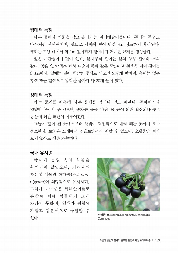 수입과 반입에 심사가 필요한 환경부 지정 위해우려종 Ⅱ 129 형태적 특징 다른 물체나 식물을 감고 올라가는 여러해살이풀이다. 뿌리는 두껍고 나무처럼 단단해지며, 옆으로 강하게 뻗어 반경 3m 정도까지 확산된다. 뿌리는 토양 내에서 약 1m 깊이까지 뻗어나가 거대한 근계를 형성한다. 잎은 계란형이며 털이 있고, 잎자루의 길이는 잎의 상부 길이와 거의 같다. 꽃은 잎겨드랑이에서 나오며 종과 같은 모양이고 흰색을 띠며 길이는 6-8㎜이다. 열매는 겉이 매끈한 형태로 익으면 노랗게 변하며, 속에는 옅은 황색 또는 갈색으로 납작한 종자가 약 20개 들어 있다. 생태적 특징 가는 줄기를 이용해 다른 물체를 감거나 덮고 자란다. 종자번식과 영양번식을 할 수 있으며, 종자는 동물, 바람, 물 등에 의해 확산되나 주로 동...