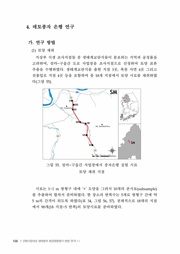 매토종자 은행 연구 가 연구 방법 토양 채취 지상부 식생 조사지점들 중 생태계교란식물이 분포하는 지역과 공정률을 고려하여 설마 구읍간 도로 사업장을 조사지점으로 선정하여 토양 표본 추출을 수행하였다 생태계교란식물 출현 지점 곳 복원 사면 곳 그리고 진출입로 지점 곳 등을 포함하여 총 개 지점에서 토양 시료를 채취하였 다 그림 그림 설마 구읍간 사업장에서 종자은행 실험 시료 토양 채취 지점 시료는 방형구 내에 모양을 그려서 개의 준시료 를 추출하여 합쳐서 준비하였다 한 장소의 반복수는 개로 방형구 간에 약 의 간격이 되도록 하였다 표 그림 전체적으로 개의 지점 에서 개 지점 반복 의 토양시료를 준비하였다 108 | 선형사업대상 생태분야 환경영향평가 방법 연구 Ⅰ