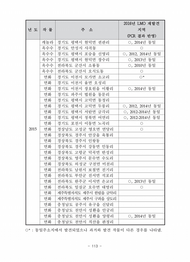 년 도 작 물 주 소 년 재발견 지역 결과 반영 2015 캐놀라 경기도 평택시 현덕면 권관리 ○, 2014년 동일 옥수수 경기도 안성시 사곡동 ○ 옥수수 경기도 평택시 포승읍 신영리 ○, 2012, 2014년 동일 옥수수 경기도 평택시 현덕면 장수리 ○, 2013년 동일 옥수수 전라북도 군산시 소룡동 ○, 2010년 동일 옥수수 전라북도 군산시 오식도동 ○ 면화 경기도 이천시 모가면 소고리 ○* 면화 경기도 이천시 율면 오성리 면화 경기도 이천시 장호원읍 이황리 ○, 2014년 동일 면화 경기도 파주시 법원읍 동문리 면화 경기도 평택시 고덕면 동청리 면화 경기도 평택시 고덕면 두릉리 ○, 2012, 2014년 동일 면화 경기도 평택시 서탄면 금각리 ○, 2012-2014년 동일 면화 경기도 평택시 청북면 어...