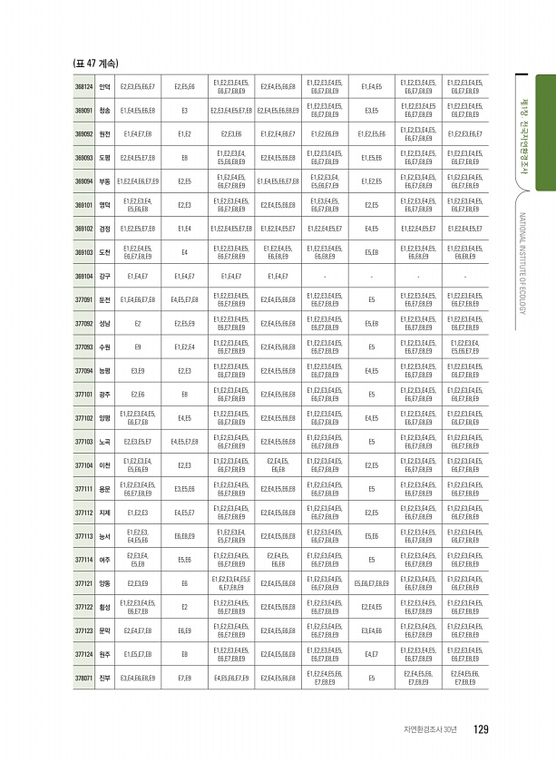 368124 안덕 E2,E3,E5,E6,E7 E2,E5,E6 E1,E2,E3,E4,E5, E6,E7,E8,E9 E2,E4,E5,E6,E8 E1,E2,E3,E4,E5, E6,E7,E8,E9 E1,E4,E5 E1,E2,E3,E4,E5, E6,E7,E8,E9 E1,E2,E3,E4,E5, E6,E7,E8,E9 369091 청송 E1,E4,E5,E6,E8 E3 E2,E3,E4,E5,E7,E8 E2,E4,E5,E6,E8,E9 E1,E2,E3,E4,E5, E6,E7,E8,E9 E3,E5 E1,E2,E3,E4,E5 E6,E7,E8,E9 E1,E2,E3,E4,E5, E6,E7,E8,E9 369092 원전 E1,E4,E7,E8 E1,E2 E2,E3,E6 E1,E2,E4,E6,E7 E1,E2,E6,E9 E1,E2,E5,E6 E...