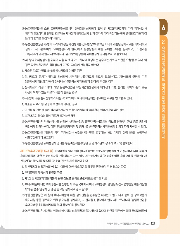 환경부 유전자변형생물체 안전관리 가이드 _129 6 유전자변형생물체의 국가간 이동 등에 관한 통합고시 2 ⑤ 농촌진흥청장은 소관 유전자변형생물체의 위해성을 심사함에 있어 법 제7조의2제3항에 따라 위해성심사 협의가 필요하다고 판단한 경우에는 제10장의 위해성심사 협의 절차에 따라 해당하는 관계 중앙행정기관의 장 등에게 협의를 요청하여야 한다. ⑥ 농촌진흥청장은 제2항에 따라 위해성심사 신청서를 접수한 날부터 270일 이내에 제출된 심사자료를 과학적으로 심사·조사·분석 이하 “위해성심사”라 한다 하여 환경방출에 대한 위해성 여부를 심사하고, 그 결과를 신청자에게 규칙 별지 제2호서식의 “유전자변형생물체 위해성심사 결과통보서”로 통보한다. ⑦ 제2항의 위해성심사를 위하여 다음 각 호의 어느 하나에 해당하는 경우...