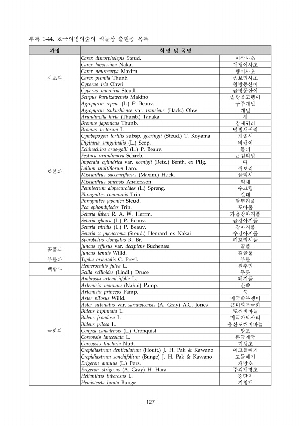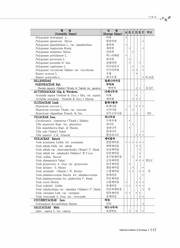 식 물 상 National Institute of EcologyⅠ117 학 명 Scientific Name 국 명 Korean Name A B C D E F 비고 Polygonum hydropiper L. 여뀌 * Polygonum japonicum Meisn. 흰꽃여뀌 * Polygonum lapathifolium L. var. lapathifolium 흰여뀌 * Polygonum longisetum Bruijn 개여뀌 * * Polygonum nepalense Meisn. 산여뀌 * Polygonum perfoliatum L. 며느리배꼽 * Polygonum persicaria L. 봄여뀌 * Polygonum posumbu D. Don 장대여뀌 * * Polygonum sagittatum L. 미꾸리낚...