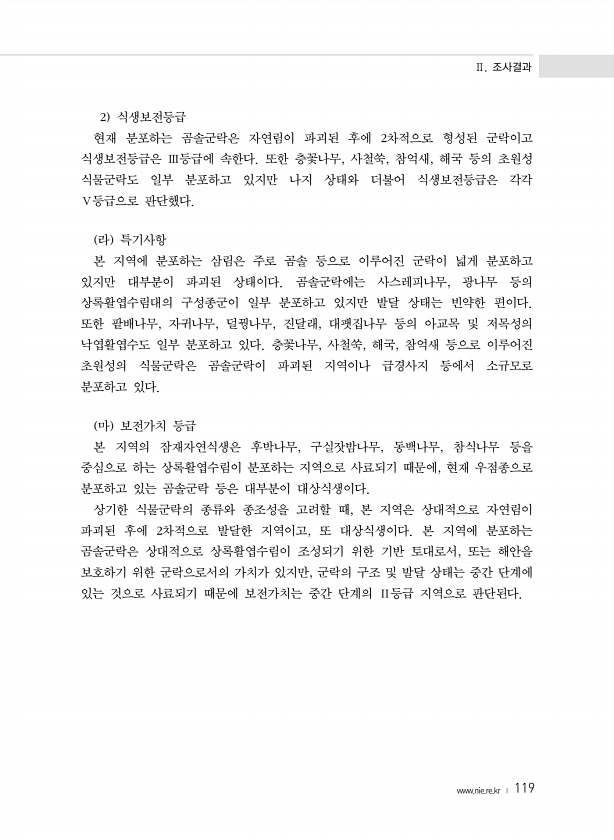 Ⅱ. 조사결과 www.nie.re.kr ? 119 2 식생보전등급 현재 분포하는 곰솔군락은 자연림이 파괴된 후에 2차적으로 형성된 군락이고 식생보전등급은 Ⅲ등급에 속한다. 또한 층꽃나무, 사철쑥, 참억새, 해국 등의 초원성 식물군락도 일부 분포하고 있지만 나지 상태와 더불어 식생보전등급은 각각 Ⅴ등급으로 판단했다. 라 특기사항 본 지역에 분포하는 삼림은 주로 곰솔 등으로 이루어진 군락이 넓게 분포하고 있지만 대부분이 파괴된 상태이다. 곰솔군락에는 사스레피나무, 광나무 등의 상록활엽수림대의 구성종군이 일부 분포하고 있지만 발달 상태는 빈약한 편이다. 또한 팥배나무, 자귀나무, 덜꿩나무, 진달래, 대팻집나무 등의 아교목 및 저목성의 낙엽활엽수도 일부 분포하고 있다. 층꽃나무, 사철쑥, 해국, 참억새 등으로 이루...