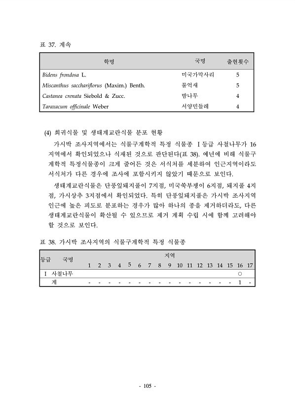 105 학명 국명 출현횟수 Bidens frondosa L. 미국가막사리 5 Miscanthus sacchariflorus Maxim. Benth. 물억새 5 Castanea crenata Siebold & Zucc. 밤나무 4 Taraxacum officinale Weber 서양민들레 4 표 37. 계속 4 희귀식물 및 생태계교란식물 분포 현황 가시박 조사지역에서는 식물구계학적 특정 식물종 Ⅰ등급 사철나무가 16 지역에서 확인되었으나 식재된 것으로 판단된다 표 38 예년에 비해 식물구 계학적 특정식물종이 크게 줄어든 것은 서식처를 세분하여 인근지역이라도 서식처가 다른 경우에 조사에 포함시키지 않았기 때문으로 보인다. 생태계교란식물은 단풍잎돼지풀이 7지점, 미국쑥부쟁이 6지점, 돼지풀 4지 점, 가시상추 3...
