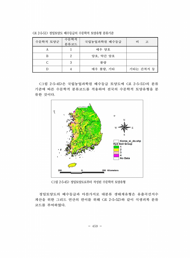 459 수문학적 토양군 수문학적 분류코드 국립농업과학원 배수등급 비 고 A 1 매우 양호 B 2 양호, 약간 양호 C 3 불량 D 4 매우 불량, 기타 기타는 간척지 등 표 2-5-51 정밀토양도 배수등급의 수문학적 토양유형 분류기준 그림 2-5-45 은 국립농업과학원 배수등급 토양도에 표 2-5-51 의 분류 기준에 따른 수문학적 분류코드를 적용하여 전국의 수문학적 토양유형을 분 류한 것이다. 그림 2-5-45 정밀토양도로부터 작성된 수문학적 토양유형 정밀토양도의 배수등급과 마찬가지로 대분류 생태계유형은 유출곡선지수 계산을 위한 그리드 연산의 편이를 위해 표 2-5-52 와 같이 식생피복 분류 코드를부여하였다.