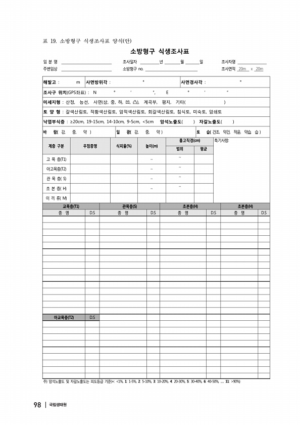 임 분 명 조사일자 년 월 일 조사자명 주변임상 소방형구 no. 조사면적 20m x 20m 해발고 m 사면방위각 ° 사면경사각 ° 조사구 위치 GPS좌표 N ° ′ ″, E ° ′ ″ 미세지형 산정, 능선, 사면 상, 중, 하, 凹, 凸 , 계곡부, 평지, 기타 토 양 형 갈색산림토, 적황색산림토, 암적색산림토, 회갈색산림토, 침식토, 미숙토, 암쇄토 낙엽부식층 ≥20cm, 19-15cm, 14-10cm, 9-5cm, 5cm 암석노출도 자갈노출도 바 람 강, 중, 약 일 광 강, 중, 약 토 습 건조, 약건, 적윤, 약습, 습 계층 구분 우점종명 식피율 % 높이 m 흉고직경 cm 특기사항범위 평균 고 목 층 T1 아고목층 T2 관 목 층 S 초 본 층 H 이 끼 류 M 교목층 T1 관목층 S 초본층 H 초본...