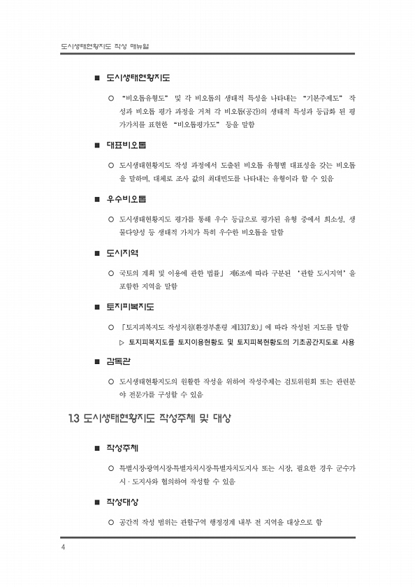 도시생태현황지도 작성 매뉴얼 4 n 도시생태현황지도 ¡ “비오톱유형도” 및 각 비오톱의 생태적 특성을 나타내는 “기본주제도” 작 성과 비오톱 평가 과정을 거쳐 각 비오톱 공간 의 생태적 특성과 등급화 된 평 가가치를 표현한 “비오톱평가도” 등을 말함 n 대표비오톱 ¡ 도시생태현황지도 작성 과정에서 도출된 비오톱 유형별 대표성을 갖는 비오톱 을 말하며, 대체로 조사 값의 최대빈도를 나타내는 유형이라 할 수 있음 n 우수비오톱 ¡ 도시생태현황지도 평가를 통해 우수 등급으로 평가된 유형 중에서 희소성, 생 물다양성 등 생태적 가치가 특히 우수한 비오톱을 말함 n 도시지역 ¡ 국토의 계획 및 이용에 관한 법률」 제6조에 따라 구분된 ‘관할 도시지역’을 포함한 지역을 말함 n 토지피복지도 ¡ 「토지피복지도 작성지침 ...