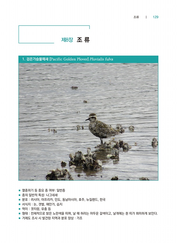 조류 ┃ 129 제8장 조 류 ■ 멸종위기 등 중요 종 여부일반종 ■ 종의 일반적 특성나그네새 ■ 분포 러시아, 아프리카, 인도, 동남아시아, 호주, 뉴질랜드, 한국 ■ 서식지 논, 갯벌, 해안가, 습지 ■ 먹이 갯지렁, 유충 등 ■ 형태 전체적으로 밝은 노란색을 띠며, 날 때 허리는 어두운 갈색이고, 날개에는 흰 띠가 희미하게 보인다. ■ 거제도 조사 시 발견된 지역과 분포 양상 가조 1. 검은가슴물떼새 [Pacific Golden Plover] Pluvialisfulva