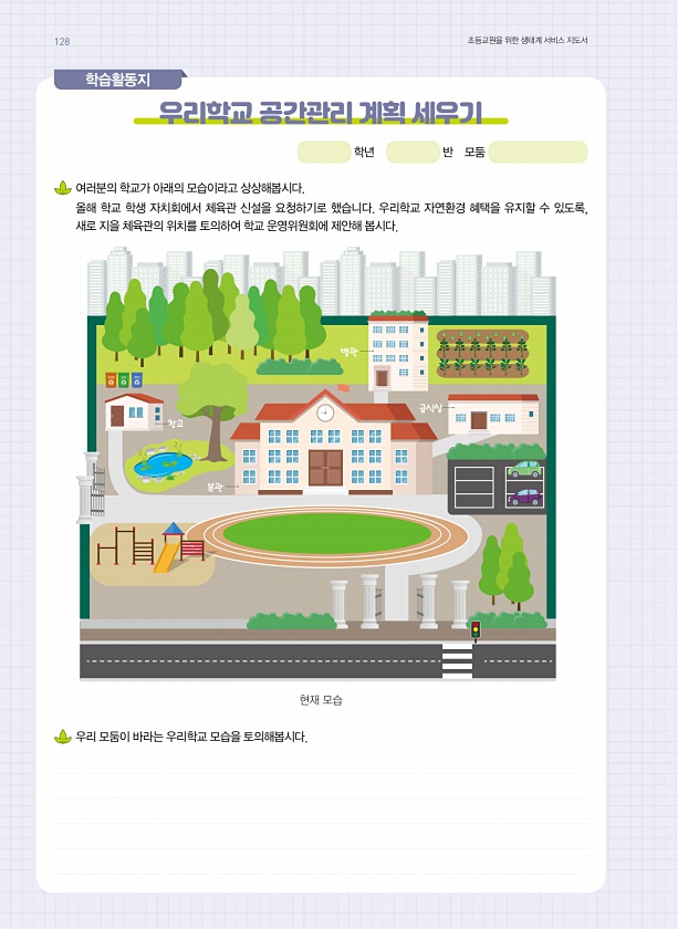학습활동지 우리학교 공간관리 계획 세우기 학년 반 모둠 여러분의 학교가 아래의 모습이라고 상상해봅시다. 올해 학교 학생 자치회에서 체육관 신설을 요청하기로 했습니다. 우리학교 자연환경 혜택을 유지할 수 있도록, 새로 지을 체육관의 위치를 토의하여 학교 운영위원회에 제안해 봅시다. 우리 모둠이 바라는 우리학교 모습을 토의해봅시다. 현재 모습 창고 본관 별관 급식실 128 초등교원을 위한 생태계 서비스지도서