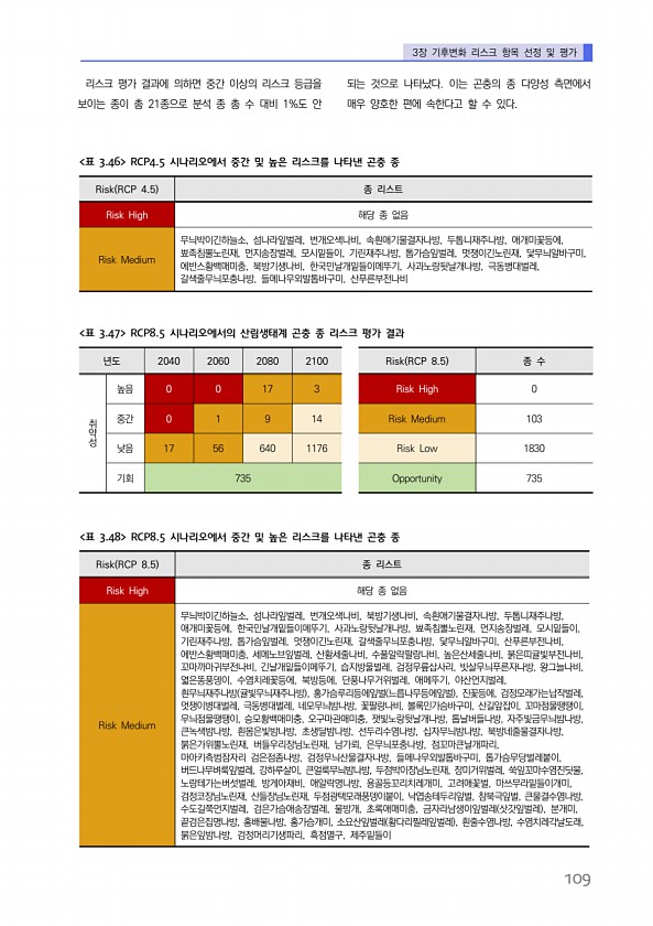 3장 기후변화 리스크 항목 선정 및 평가 109 리스크 평가 결과에 의하면 중간 이상의 리스크 등급을 보이는 종이 총 21종으로 분석 종 총 수 대비 1%도 안 되는 것으로 나타났다. 이는 곤충의 종 다양성 측면에서 매우 양호한 편에 속한다고 할 수 있다. Risk RCP 4.5 종 리스트 Risk High 해당 종 없음 Risk Medium 무늬박이긴하늘소, 섬나라잎벌레, 번개오색나비, 속흰애기물결자나방, 두톱니재주나방, 애개미꽃등에, 뾰족침뿔노린재, 먼지송장벌레, 모시밑들이, 기린재주나방, 톱가슴잎벌레, 멋쟁이긴노린재, 닻무늬알바구미, 에반스황백매미충, 북방기생나비, 한국민날개밑들이메뚜기, 사과노랑뒷날개나방, 극동병대벌레, 갈색줄무늬포충나방, 들메나무외발톱바구미, 산푸른부전나비 표 3.46 RCP4.5 ...