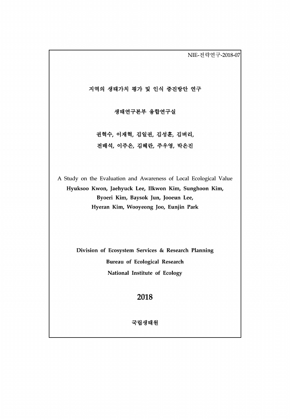 NIE-전략연구-2018-07 지역의 생태가치 평가 및 인식 증진방안 연구 생태연구본부 융합연구실 권혁수, 이재혁, 김일권, 김성훈, 김벼리, 전배석, 이주은, 김혜란, 주우영, 박은진 A Study on the Evaluation and Awareness of Local Ecological Value Hyuksoo Kwon, Jaehyuck Lee, Ilkwon Kim, Sunghoon Kim, Byoeri Kim, Baysok Jun, Jooeun Lee, Hyeran Kim, Wooyeong Joo, Eunjin Park Division of Ecosystem Services & Research Planning Bureau of Ecological Research National Institute of...