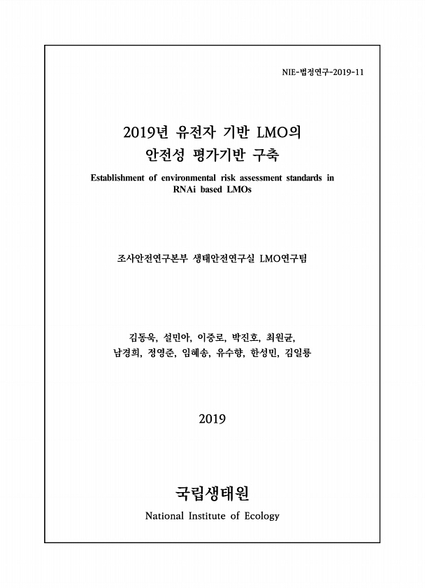 NIE-법정연구-2019-11 2019년 유전자 기반 LMO의 안전성 평가기반 구축 Establishment of environmental risk assessment standards in RNAi based LMOs 조사안전연구본부 생태안전연구실 LMO연구팀 김동욱, 설민아, 이중로, 박진호, 최원균, 남경희, 정영준, 임혜송, 유수향, 한성민, 김일룡 2019 국립생태원 National Institute ofEcology