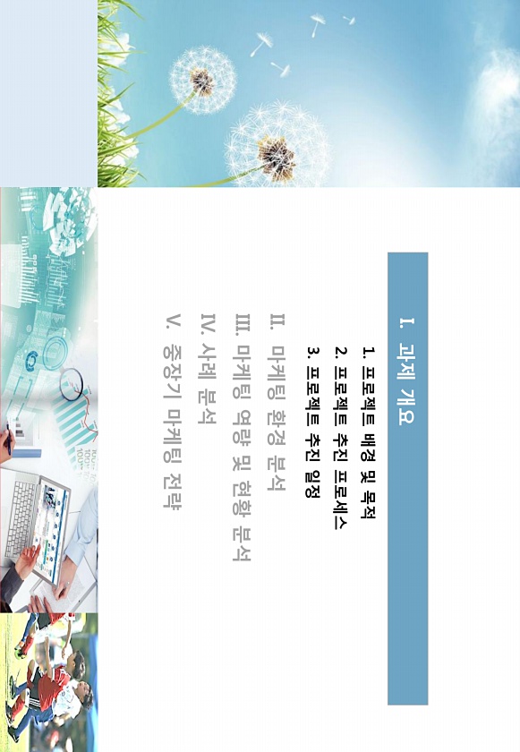 1. 프로젝트 배경 및 목적 2. 프로젝트 추짂 프로세스 3. 프로젝트 추짂 읷정 II. 마케팅 홖경 붂석 III. 마케팅 역량 및 현황 붂석 IV. 사례 붂석 V. 중장기 마케팅 젂략 I. 과제개요