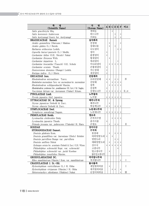 2016 백두대간보호지역 생태계 조사 밀재묘적재 118Ⅰwww.nie.re.kr 학 명 Scientific Name 국 명 Korean Name A B C D E F 비고 Salix gracilistyla Miq. 갯버들 * Salix koreensis Andersson 버드나무 * * Salix koriyanagi Goerz for. koriyanagi 키버들 * * BRASSICACEAE Burnett 십자화과 Arabis gemmifera Matsum. Makino 산장대 * * Arabis glabra L. Bernh. 장대나물 * * Barbarea orthoceras Ledeb. 나도냉이 * * Capsella bursa-pastoris L. Medik. 냉이 * Cardamine fallax O...